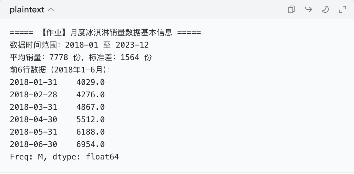 print("===== 【作业】月度冰淇淋销量数据基本信息 =====")