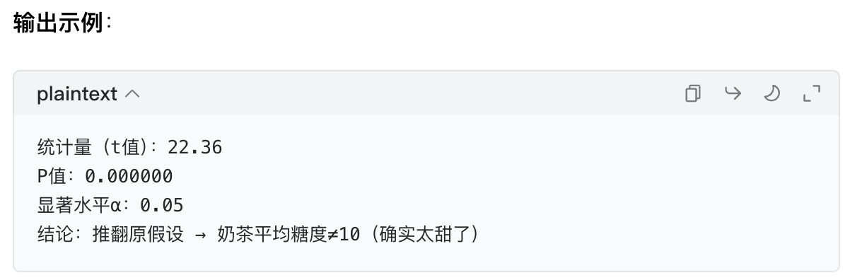 - 显著水平(α):你设定的 "容错率",通常选 0.05(5%)。意思是:"如果奶茶其实甜度刚好(H₀真),但我错误判定'太甜'的概率最多 5%"。