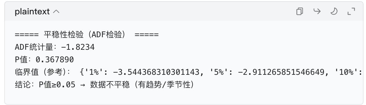 - 核心看两个指标:✅ ADF 统计量:越小(越负),越容易推翻 H₀ → 越平稳;✅ P 值:P <α(0.05)→ 推翻 H₀ → 平稳;P> α → 不平稳。