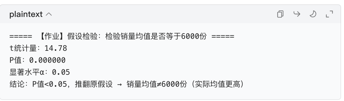 print("结论:P值<0.05,推翻原假设 → 销量均值≠6000份(实际均值更高)")