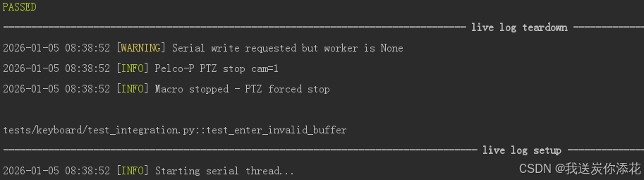 python# tests/keyboard/test_integration.py import pytest from unittest.mock import patch, MagicMock from ui.keyboard.panel import KeyboardPanel from core.protocol import ptz_control @pytest.fixture def keyboard(qapp): kb = KeyboardPanel() kb.serial_mgr = MagicMock() # mock 串口 return kb @pytest.mark.keyboard def test_joystick_to_protocol(keyboard): with patch('core.protocol.ptz_control') as mock_ptz: keyboard.joystick_moved.emit(10, -20) mock_ptz.assert_called_with(keyboard.serial_mgr, ..., 10, -20) @pytest.mark.keyboard def test_enter_error_indicator(keyboard): keyboard.input_buffer = "invalid" keyboard.indicator_manager.on = MagicMock() keyboard._on_enter() keyboard.indicator_manager.on.assert_called_with("ERR") -