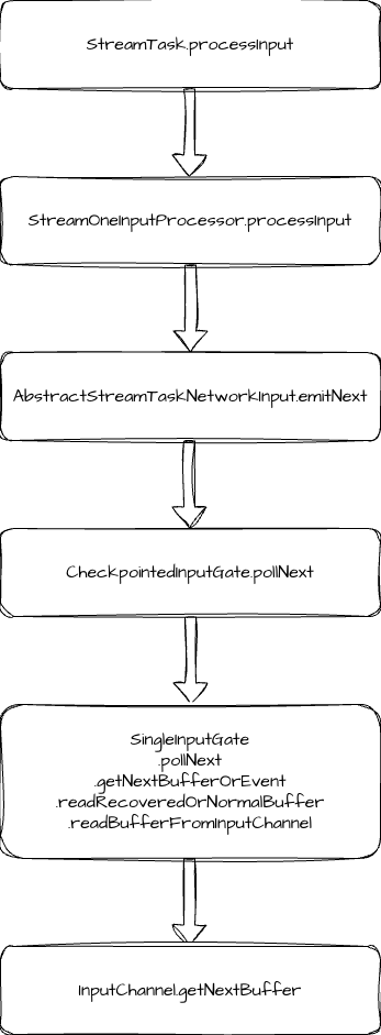 我们以 SingleInputGate 为例看 InputGate 的 pollNext 方法。它的内部调用链路可用一直追踪到 readBufferFromInputChannel 方法,这个方法内会调用 inputChannel.getNextBuffer,这里交给 InputChannel 来具体执行数据读取。