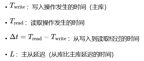 Δt = 7秒, L = 9秒条件:7 ≥ 9 ❌结果:从库还未同步写入,读取会得到旧数据例如用户写入后,数据被同步到了所有从库,用户第二天发起查询请求,此时点位信息以及过期,且用户写入主库数据已经同步到所有从库。用户此时需要判断主从延时,假设此时主从延时达到30s.但是用户昨天的数据早已写入,此时还是会被路由到主库。
