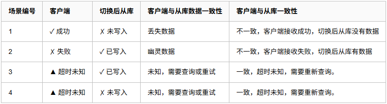 读写分离场景下,用户不关注主从数据是否一致,用户只关注客户端接收响应,与切换后从库数据状态。所以我们提取这两列。去除不可能出现和前后一致的情况,保留不一致的情况如下: