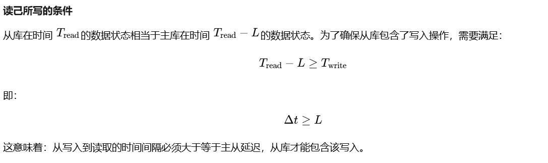 延迟时间小于等于过期时间的从库,可以读取到之前的写入数据,但如果延时时间大于过期时间,实际存在两种情况,一种是可以读取到,一种是无法读取到。此时由于点位已经过期,无法区分出来。所以统一走降级逻辑查主库。从库包含写入的条件:Δt ≥ L。延时时间(L)大于过期时间(6s)Δt = 10秒, L = 8秒条件:10 ≥ 8 ✅结果:从库已包含写入,可以安全读取