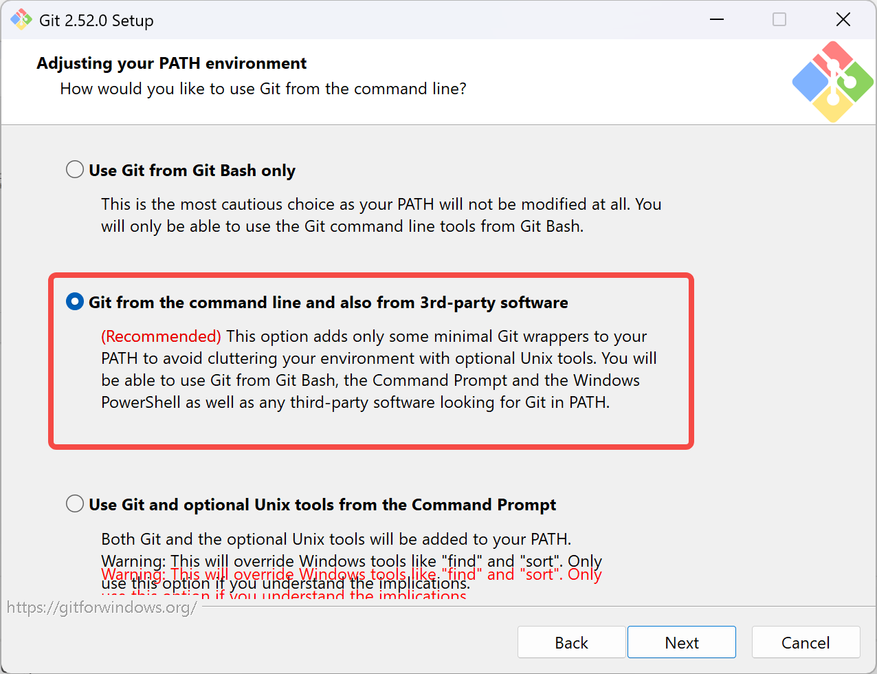 它不仅把 Git 放进环境变量,还把一大堆 Linux/Unix 的工具命令(如 ls, find, sort 等)强行塞进 Windows 的系统路径里。Windows 系统本身也有叫 find 和 sort 的命令,但用法和 Linux 的完全不一样。如果你选了这个,Git 自带的 Linux 版本会"覆盖"掉 Windows 自带的版本