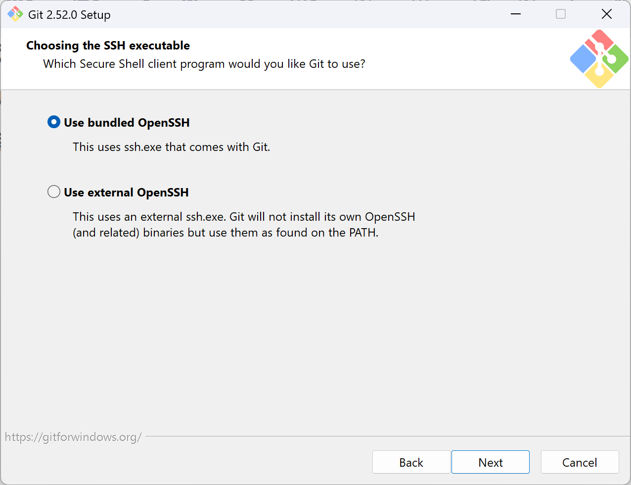 选择这项,意味着 Git 会使用它自己文件夹里的 ssh.exe