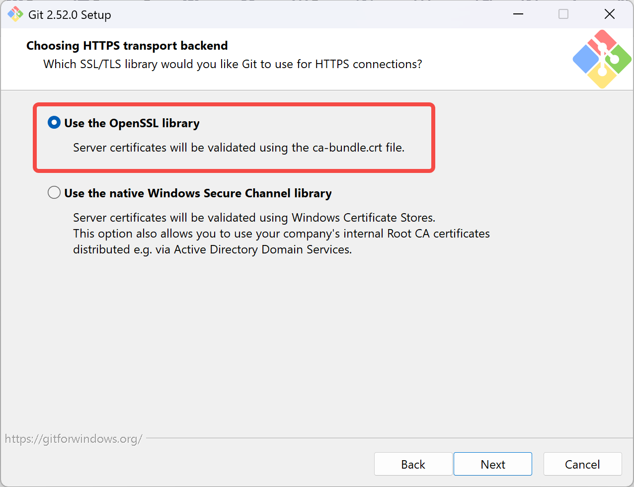 选项 2:Use the native Windows Secure Channel library (使用 Windows 原生安全通道库)