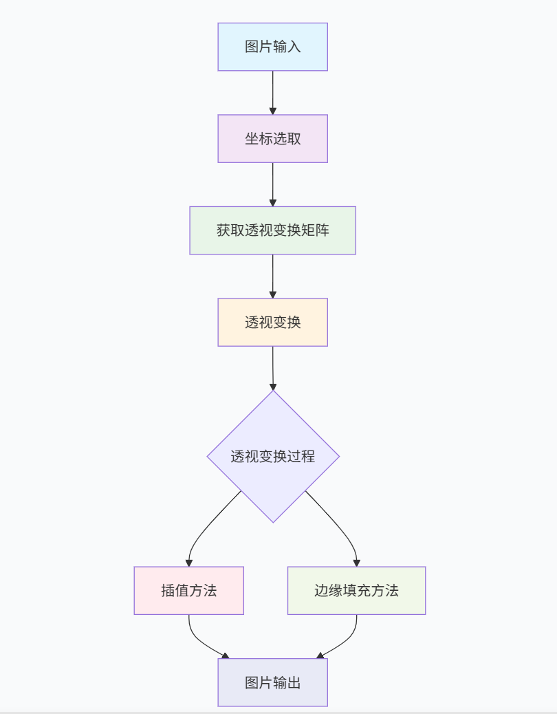 src:输入图像M:3×3透视变换矩阵dsize:输出图像大小,(宽度, 高度)flags:插值方法(可选,默认为INTER_LINEAR)borderMode:边界填充模式(可选)borderValue:边界填充值(可选)