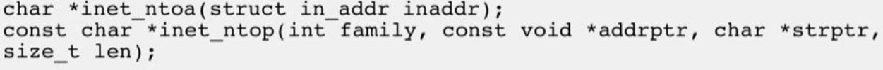 其中 inet_pton和 inet_ntop 不仅可以转换 IPv4 的 in_addr,还可以转换 IPv6 的
