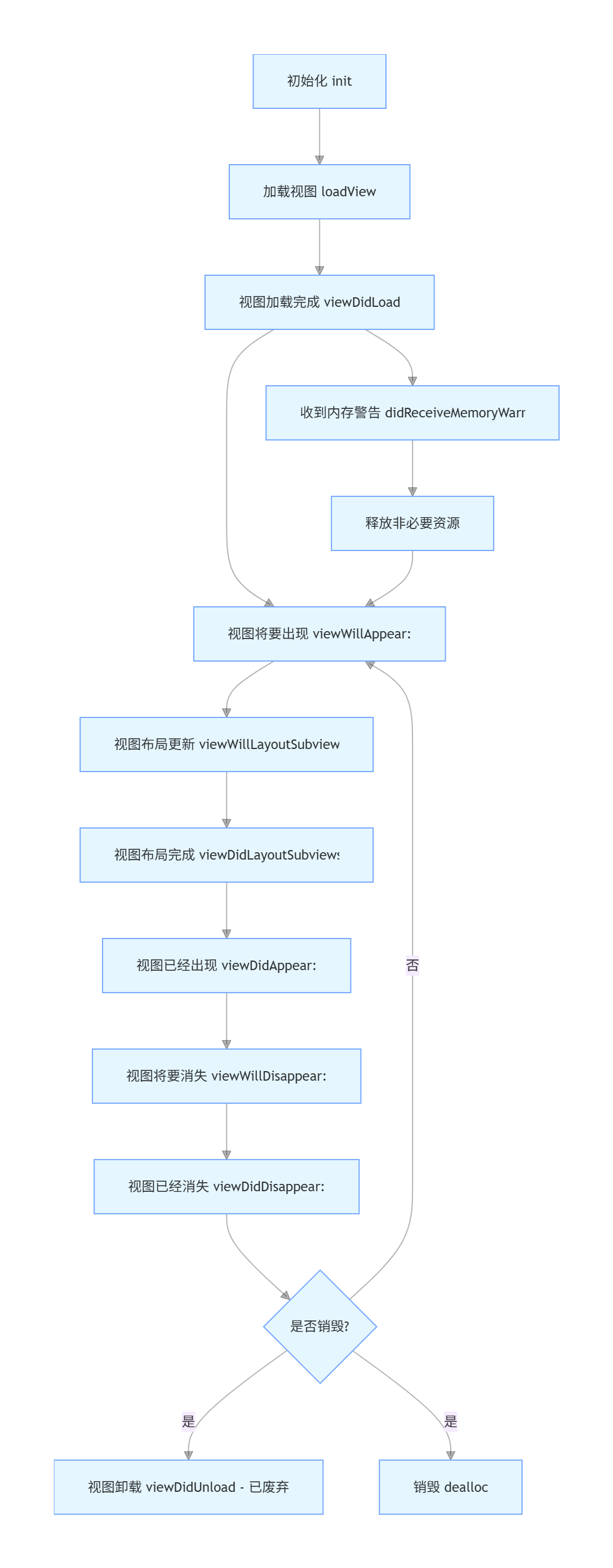 init→loadView→viewDidLoad→viewWillAppear:→viewWillLayoutSubviews→viewDidLayoutSubviews→viewDidAppear:→viewWillDisappear:→viewDidDisappear:→dealloc。 - 关键区分 :