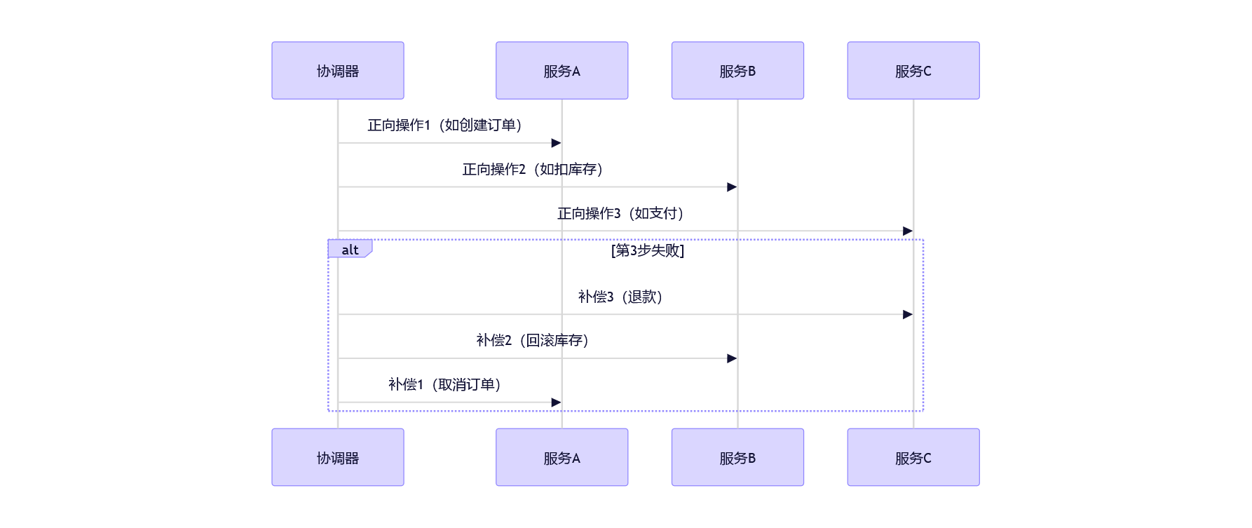 在微服务时代,Saga 模式更受欢迎。它不是一个单一协议,而是一种补偿机制。 Saga 将长事务拆分成多个本地子事务,每个子事务有对应的补偿操作、。如果某步失败,就执行前面的补偿来"回滚"。