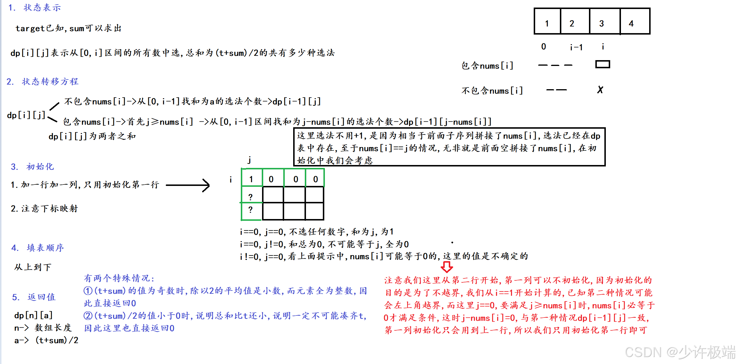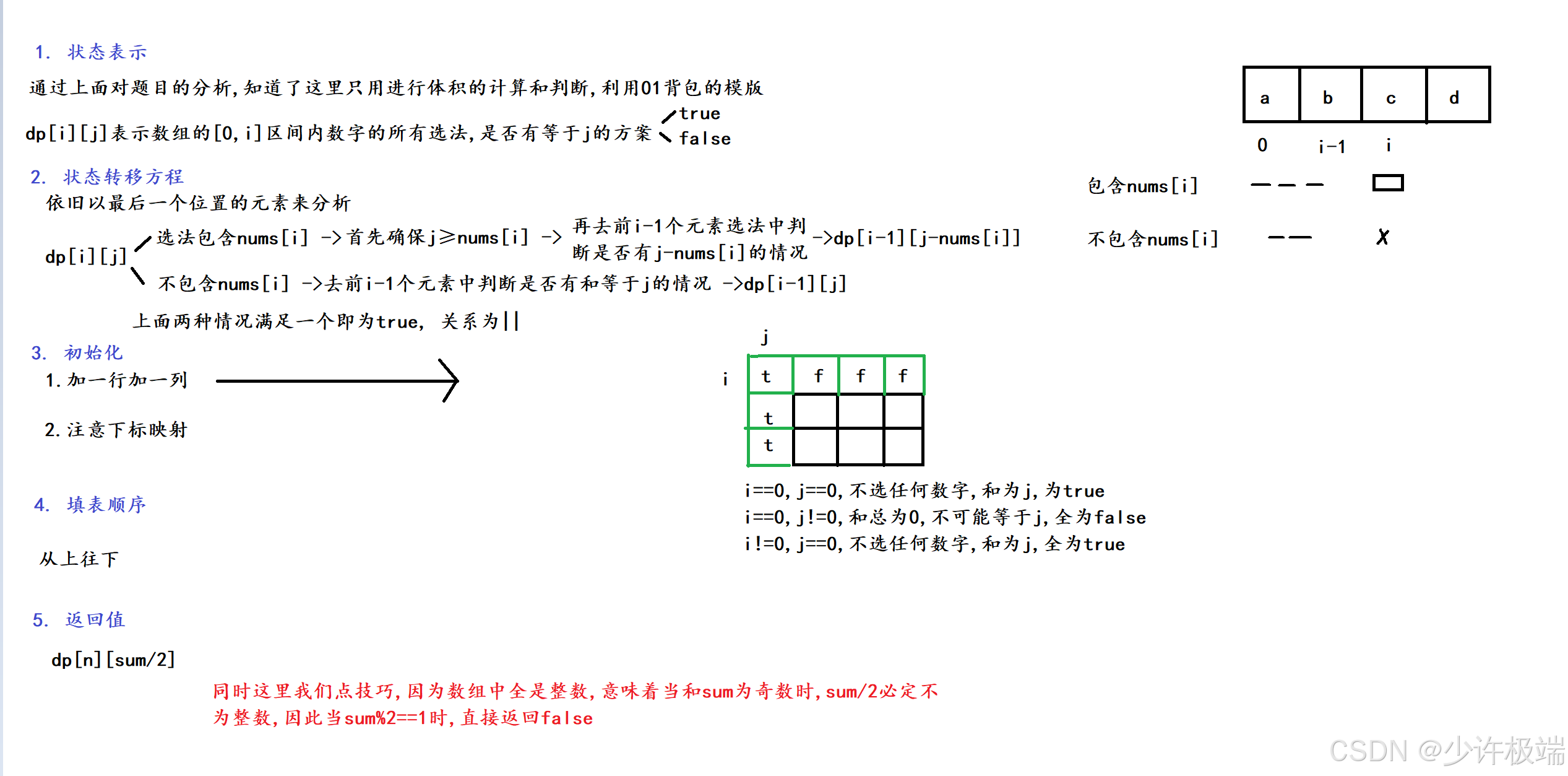 刚开始我在想, 为什么不用计算总和, 只用true和false就能表示总和, 后来当我想到是空间1遍历到j的, 意味着[0,i]区间选法的总和是以布尔形式表示了, 自此又进一步懂了一些