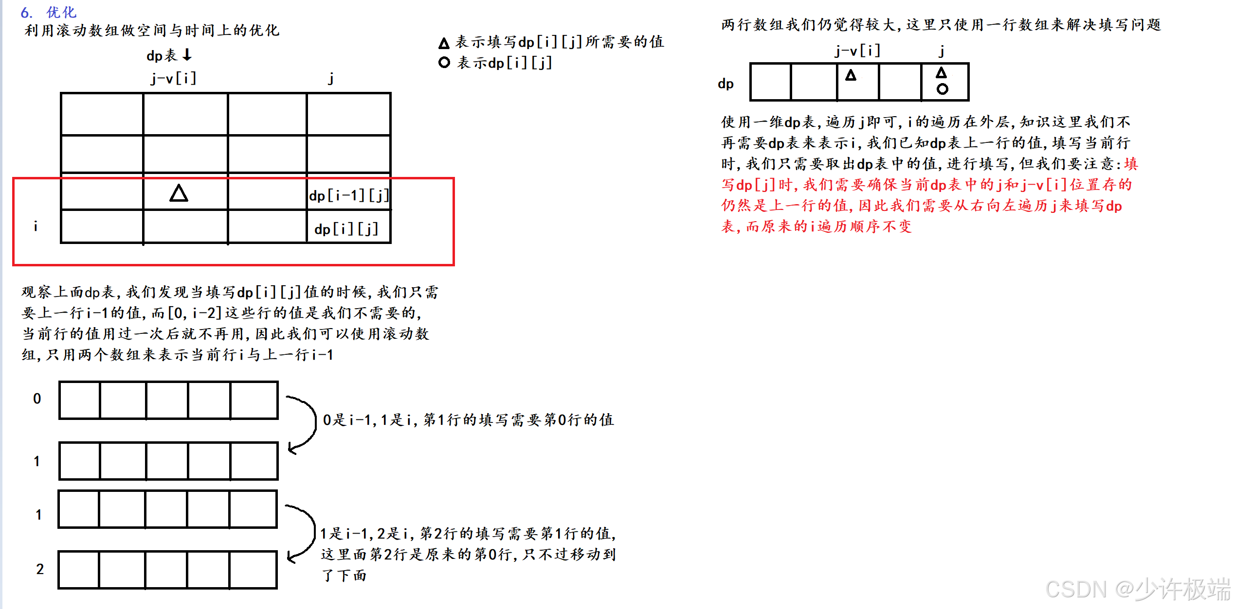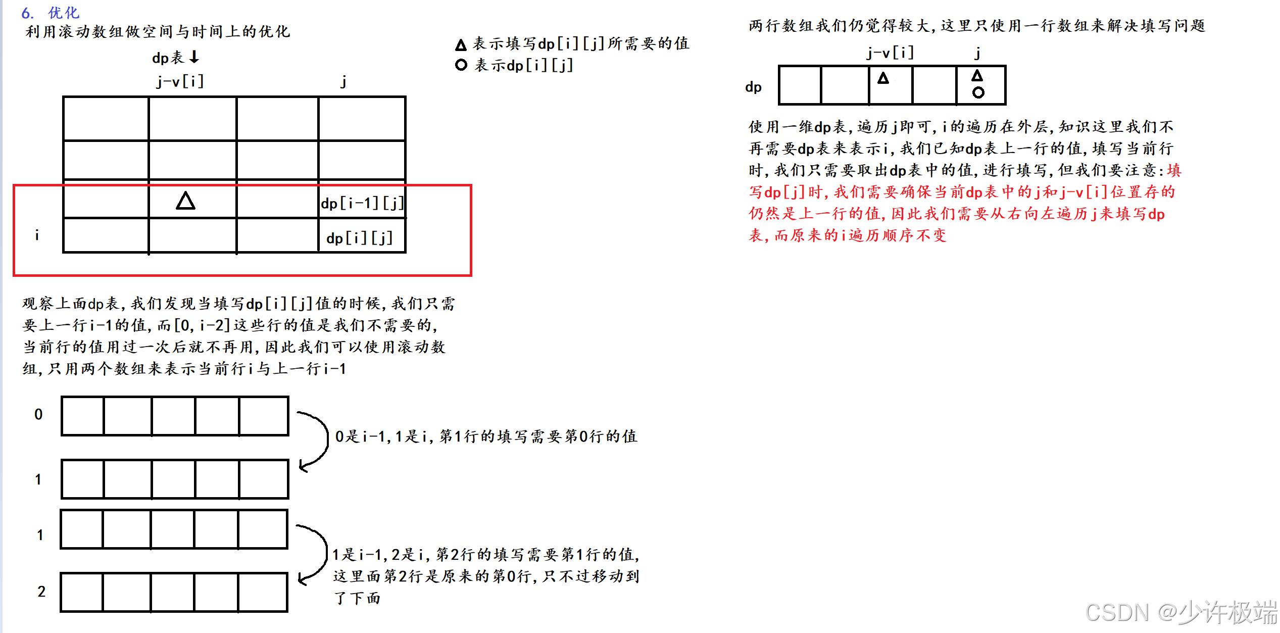 因为这里和01背包的优化方式一样, 这里我们不过多赘述, 直接copy上面图片: ①删除行保留列 ②修改 j 的遍历顺序