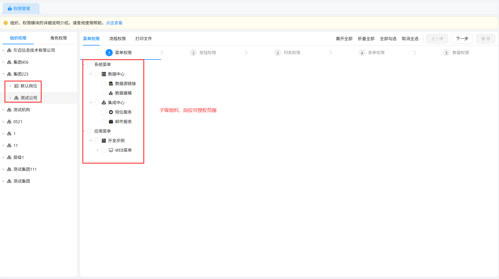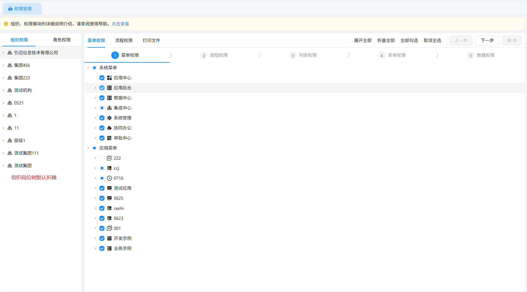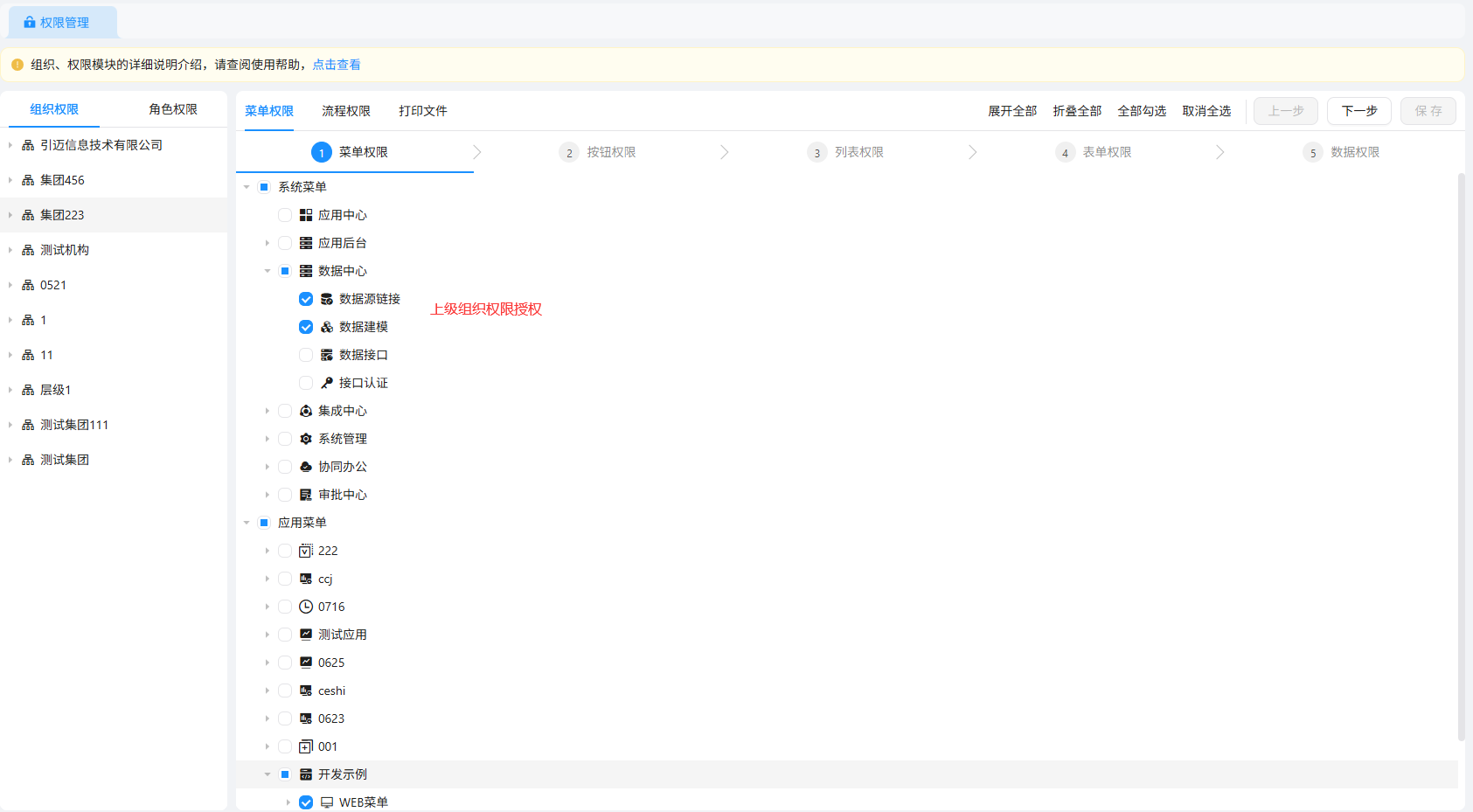 勾选所需权限后点击下一步,直至数据权限页面,点击确定即可保存权限的授权;顶级组织菜单权限展示所有菜单权限,页面支持展开全部、折叠全部、全部勾选、取消全选等操作