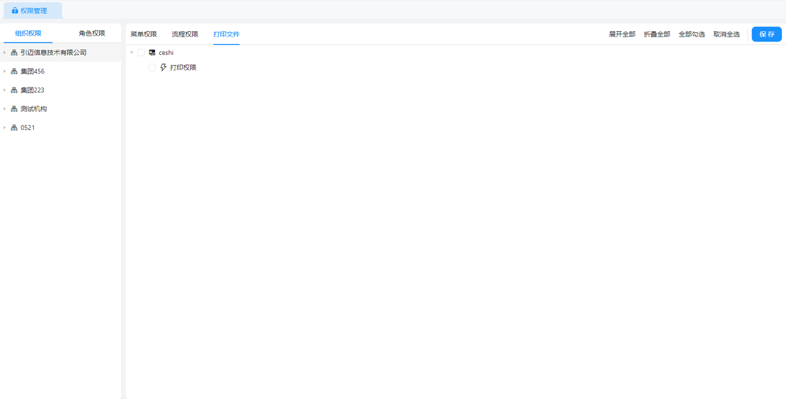 点击打印文件,展示在【打印设计】中开启通用-权限设置的所有打印设计,页面支持展开全部、折叠全部、全部勾选、取消全选等操作,点击保存即可完成打印模板授权