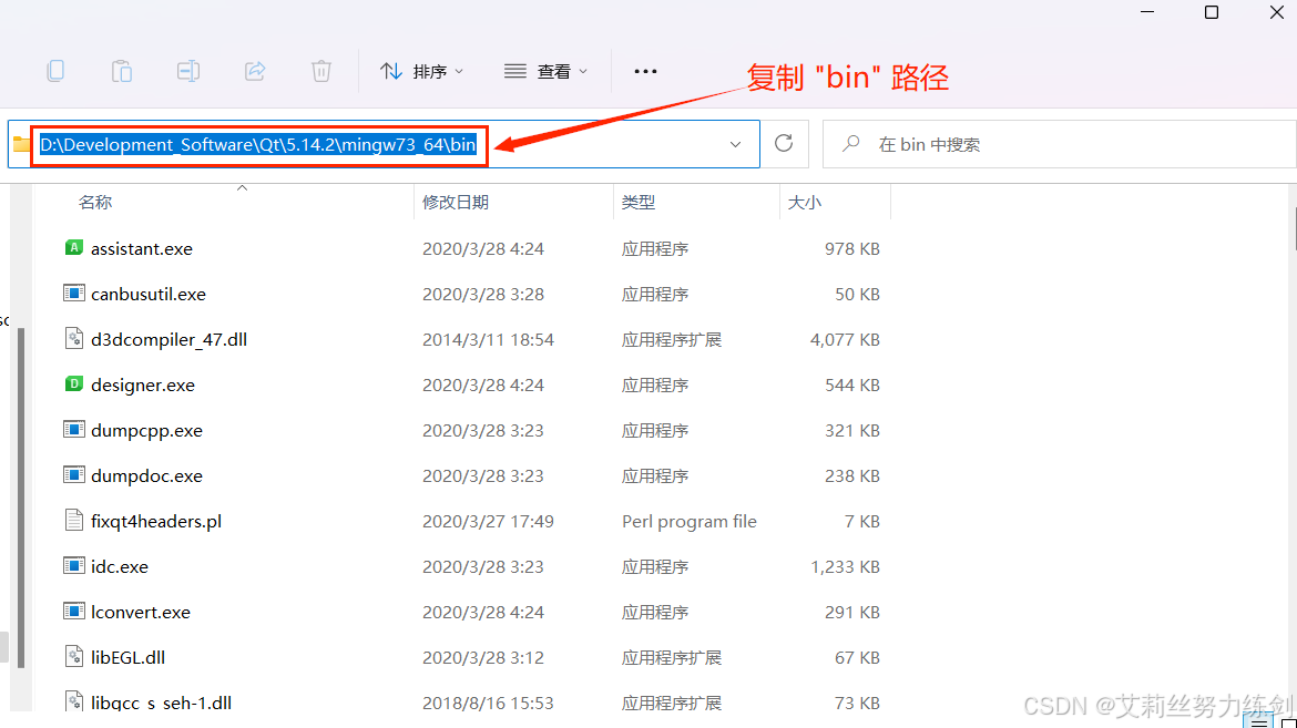 1、找到Qt的安装路径,复制"bin"路径: