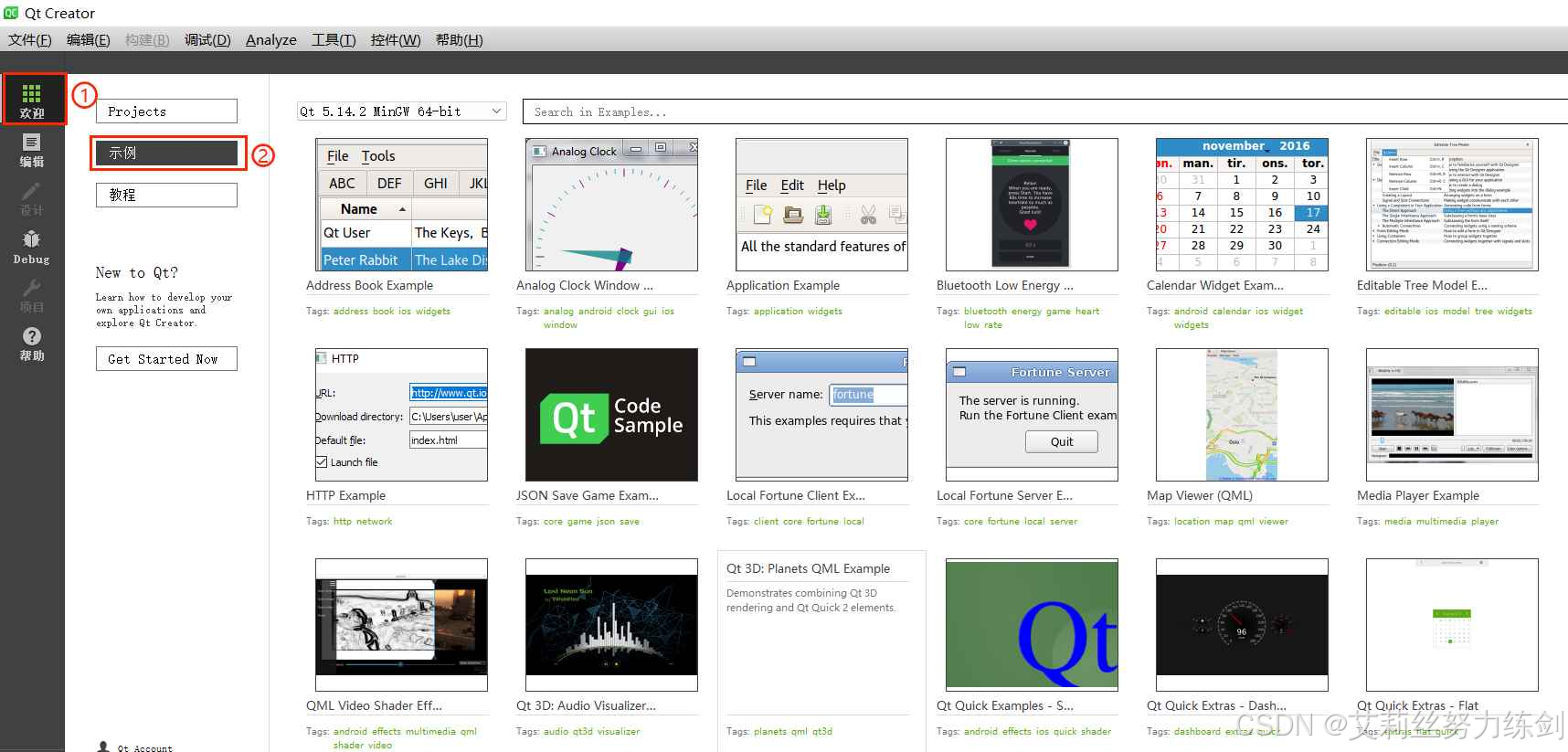 1、双击打开Qt Creator工具,并进入到"欢迎模式"下的"示例"界面: