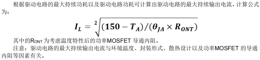 持续电流能力公式: IL = √[(150 - TA) / (θJA × RDS(ON)_TOTAL)],必须根据实际散热条件重新评估。