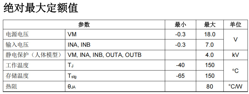 - 逻辑输入电压(INA, INB)范围 0V 至 5.0V(推荐),最大值 7.0V,兼容 3.3V/5V 逻辑
