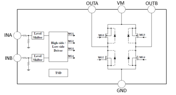 - H 桥导通电阻(RDS(ON)) 典型 0.11Ω,最大值 0.2Ω(IOUT=1.0A, VM=6V 条件下测试)