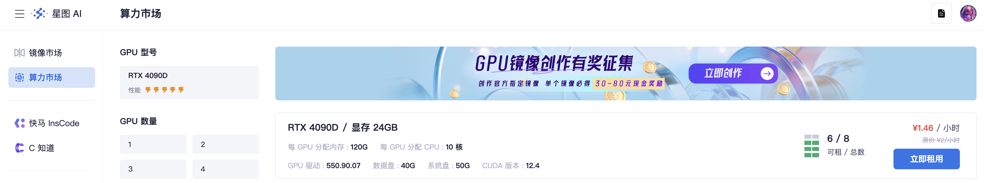 确定好任务后,根据模型所需算力资源的大小,我们去算力市场租用GPU。