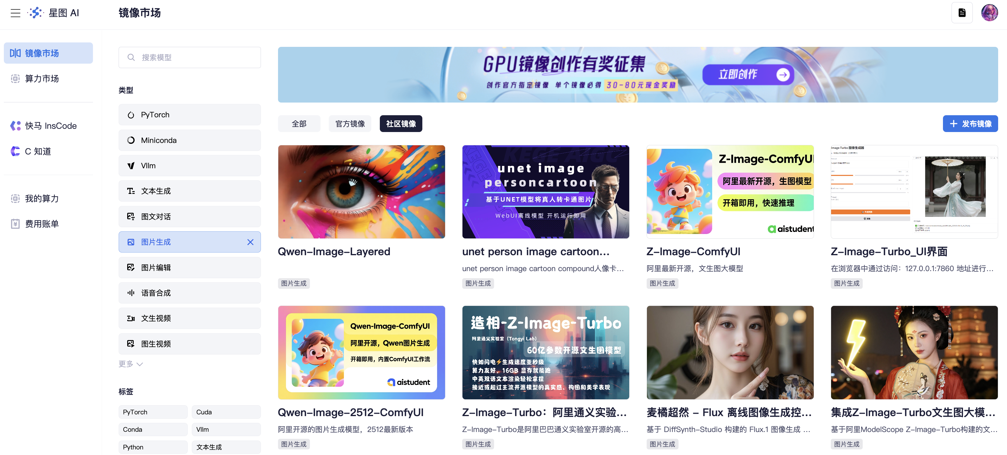 官方明确列出了以下多个镜像创作任务,这些任务主要集中在 AI 领域,涵盖了图像生成、大语言模型、语音识别、语音合成和图像处理。