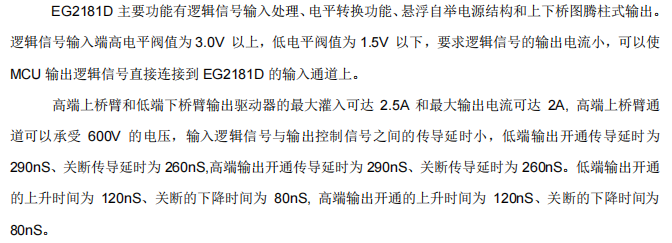 - 与EG2181的最大区别在于:输入信号不相互闭锁,且内部无死区时间控制。HIN和LIN输入直接控制HO和LO输出,当两者同时为高时将导致上下管直通,防直通责任完全在外围控制器