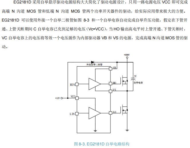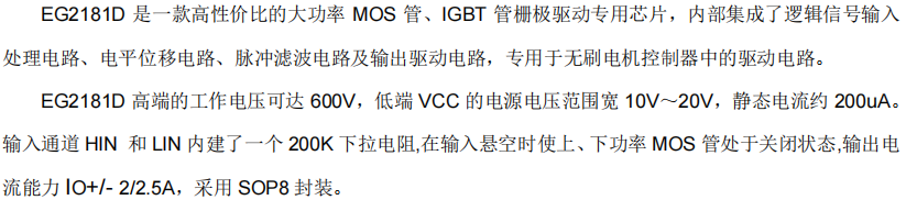 EG2181D 是一款在 SOP8 封装内集成了欠压保护功能 的单通道半桥栅极驱动专用芯片
