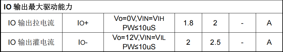 - 峰值拉电流(IO+)典型 2A,最小 1.8A(VO=0V,脉宽≤10μs)