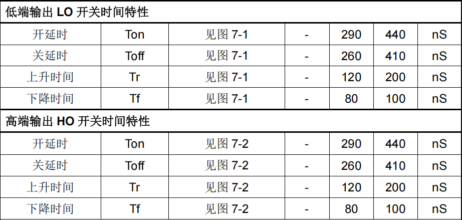 - 低端输出LO 开通延时(Ton)典型 290ns,最大 440ns;关断延时(Toff)典型 260ns,最大 410ns