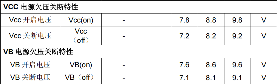 - 高端悬浮电源(VB)耐压 600V(极限值),开启阈值典型 8.6V,关断阈值典型 8.1V(欠压保护)