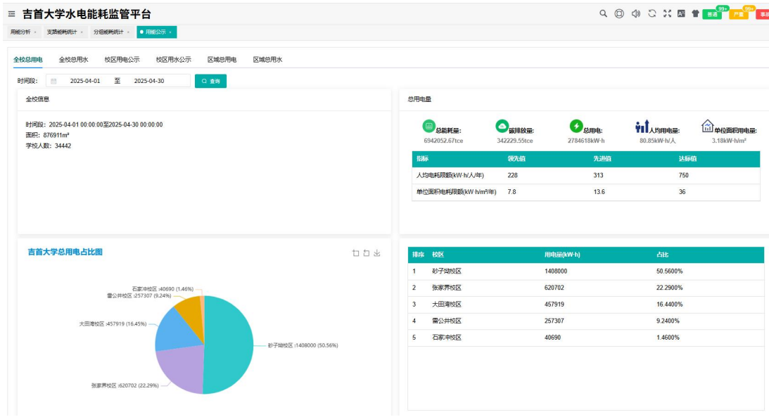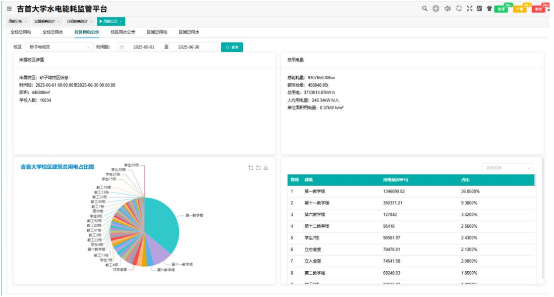 该系统首先实现对全校水、电消耗数据的综合采集与展示。通过在各校区、各楼栋的关键节点部署计量设备,平台能够实时汇总用能数据,并按照日、月等周期进行统计分析,形成校区、建筑之间的用能排名,帮助管理者宏观掌握校园能源消耗态势。