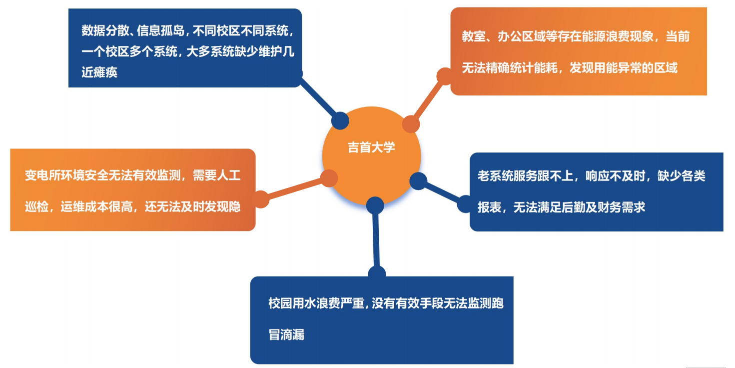 位于湖南省湘西土家族苗族自治州的吉首大学,是一所涵盖五个校区、在校生约三万人的综合性大学。校园面积广阔,功能区多样,包括教学楼、宿舍、实验室、食堂等多种建筑类型,能源消耗结构复杂。过去,学校在能耗计量方面存在体系不完整、设备品牌杂乱、系统之间信息不互通等情况。宿舍区使用多家不同厂商的电表及收费系统,数据难以统一汇集;公共区域的照明、设备用电缺乏有效监控与调控机制;水电费用收缴涉及多部门、多主体,对账流程繁琐且易出错;重要设施如电梯、水泵等无法实现远程监测与预警,依赖人工巡检,维护成本高且响应速度慢。此外,校园中普遍存在的"长明灯""待机能耗"等现象,也缺乏有效的技术干预手段。