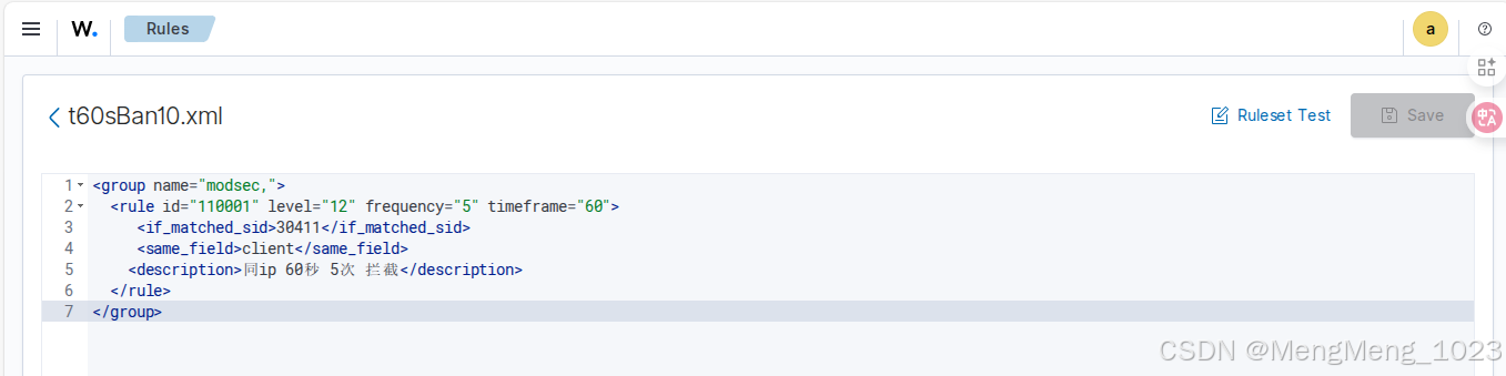 经过上面的规则编写,同ip 60秒 5次 拦截的进行一个规则告警id 110001