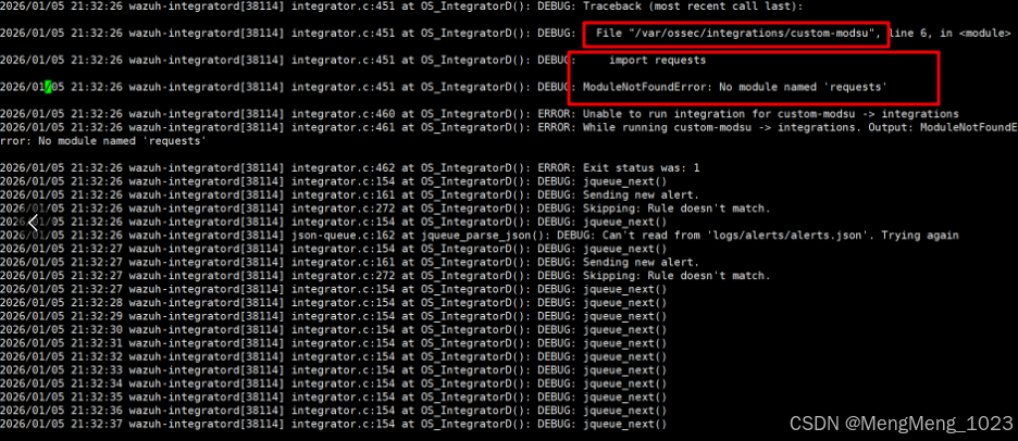 此时可以在/var/ossec/logs/ossec.log 中查看integrator相关执行日志