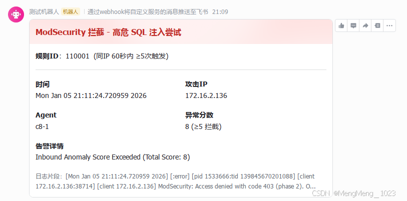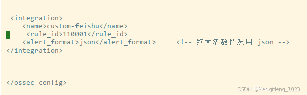<integration> <name>custom-feishu</name> <rule_id>110001</rule_id> <alert_format>json</alert_format> <hook_url>填你的飞书webhook链接</hook_url> </integration>custom-必不可少,后面的可以自己修改