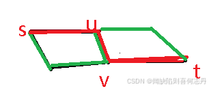 性质 :方式一 s → u → v → t s \rightarrow u \rightarrow v \rightarrow t s→u→v→t和方式二 s → v → u → t s \rightarrow v \rightarrow u \rightarrow t s→v→u→t可能两条路径都低于K分钟,也可能一条低于,另一条高于。