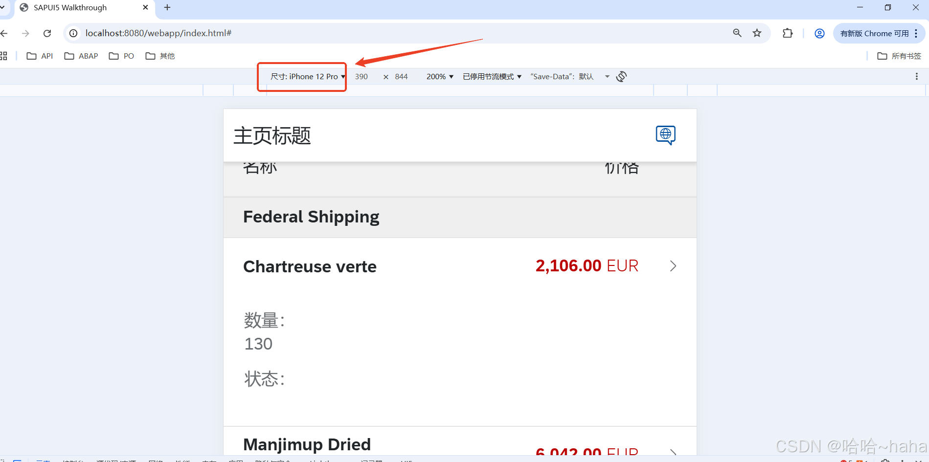 浏览器打开开发者工具,切换单元素页签,选择设备iphone 12 pro 如下