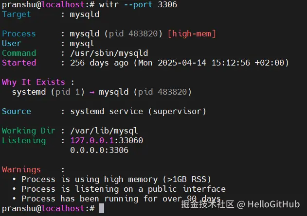 这是一个用 Go 编写的命令行诊断工具,用于快速定位和分析正在运行的进程。它通过端口、服务名或 PID 映射进程信息,生成通俗易懂的进程因果链,直观展示进程的来源、启动方式和持续运行的原因,帮助运维与开发者排查和定位异常进程。