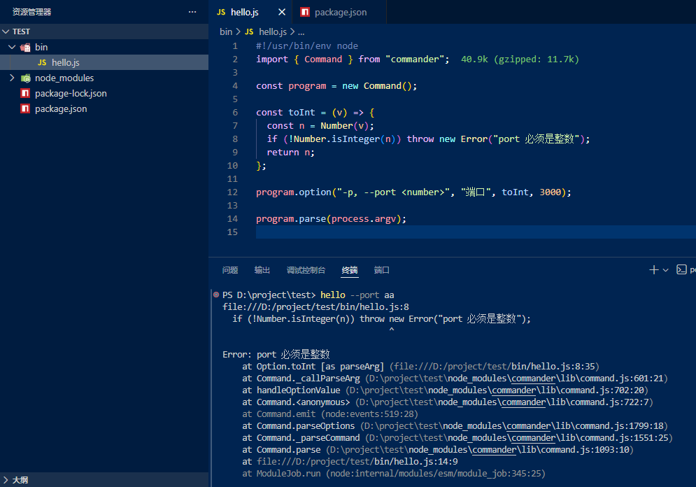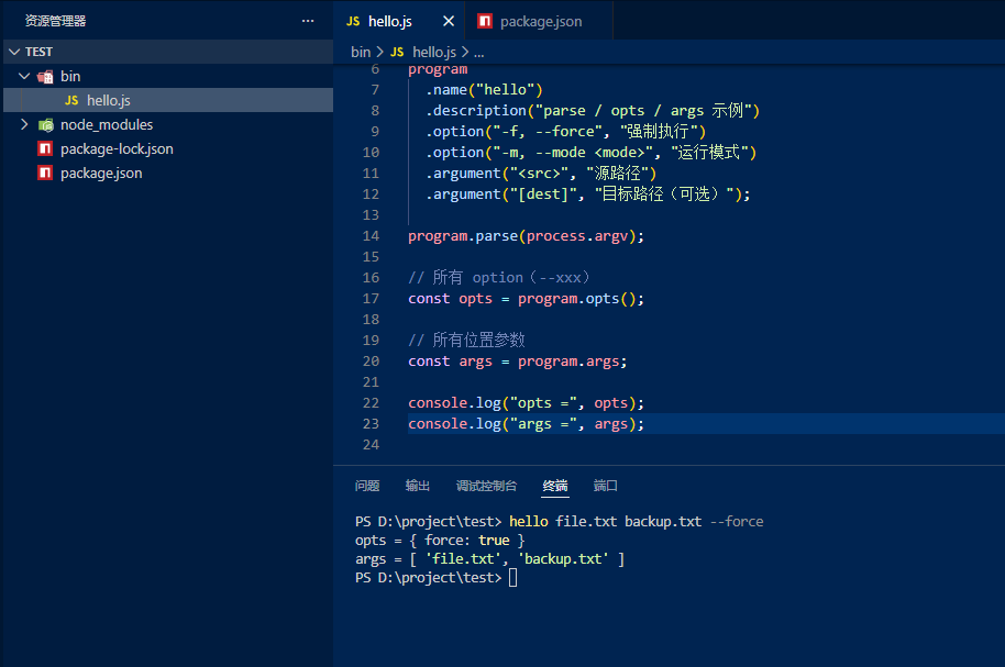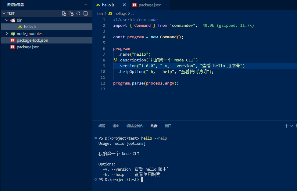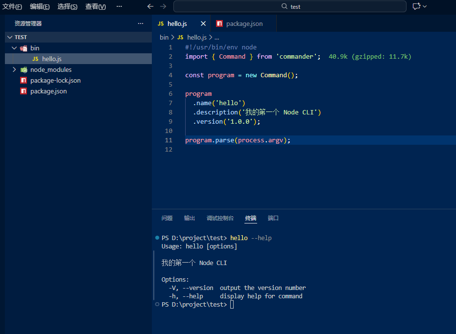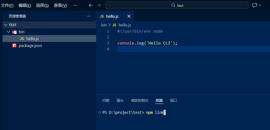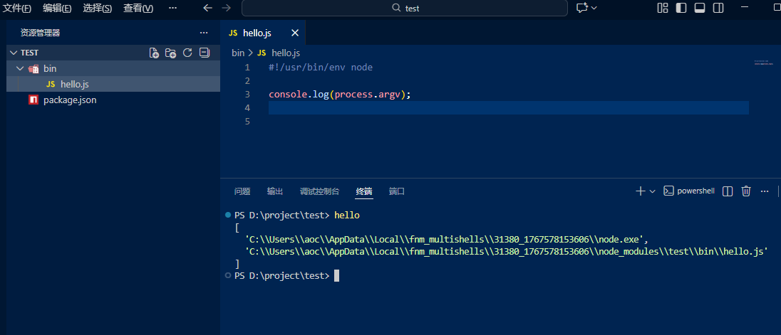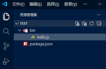 bin 目录下新建一个 js 文件, hello.js (如果是 Linux / MacOS 环境,需要给 hello.js 文件权限 chmod +x bin/hello.js )