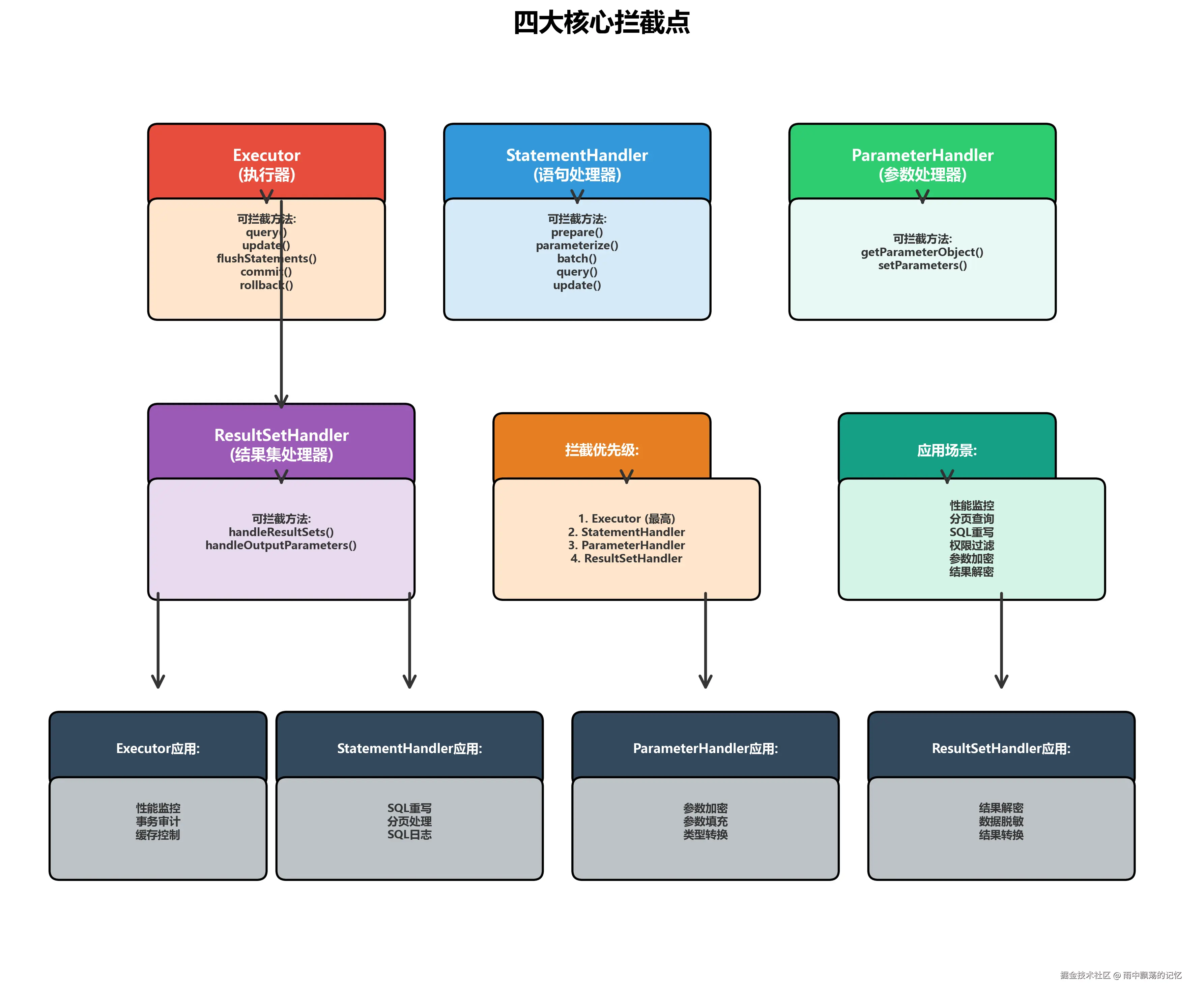 - 四大拦截点:Executor、StatementHandler、ParameterHandler、ResultSetHandler