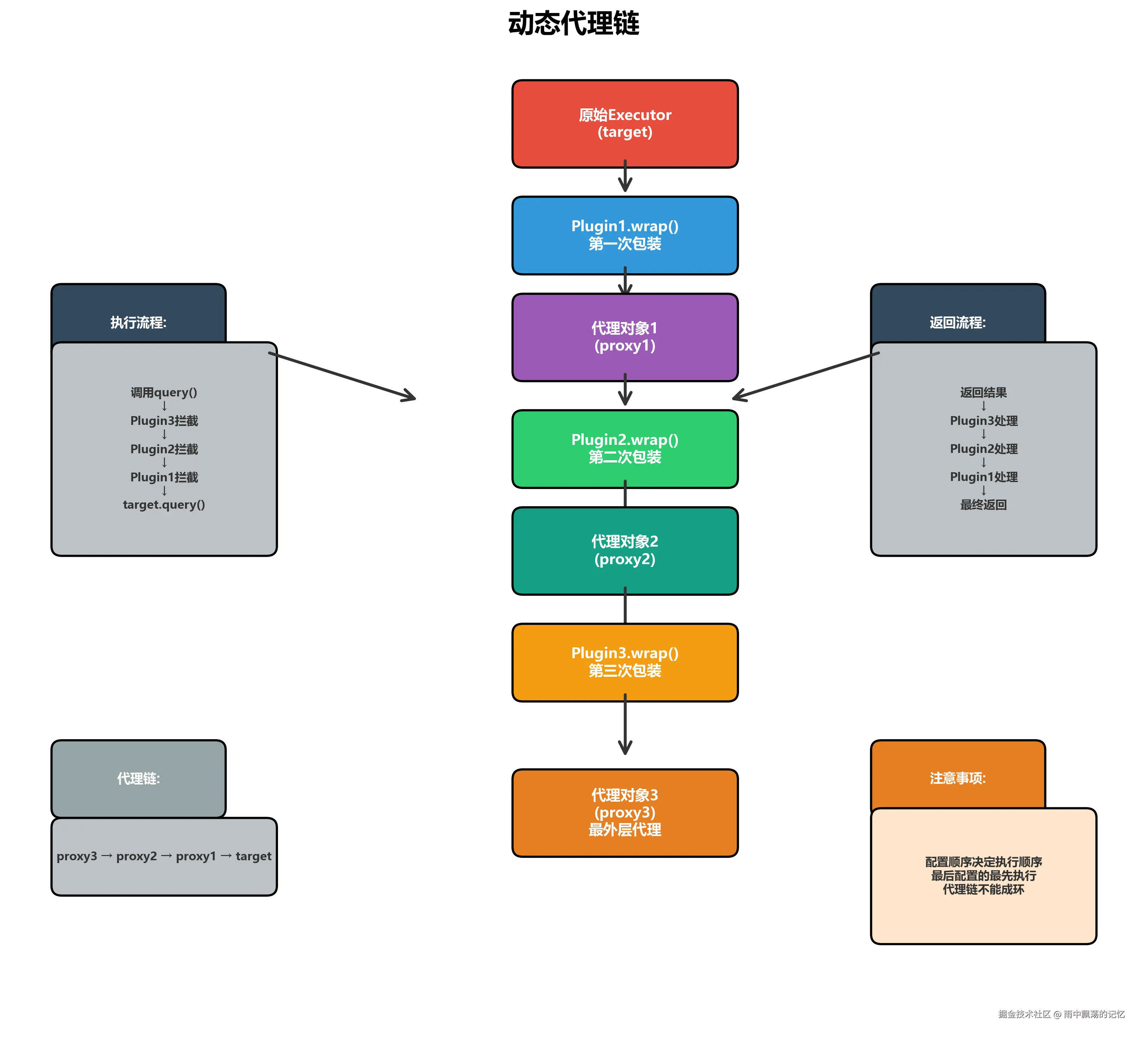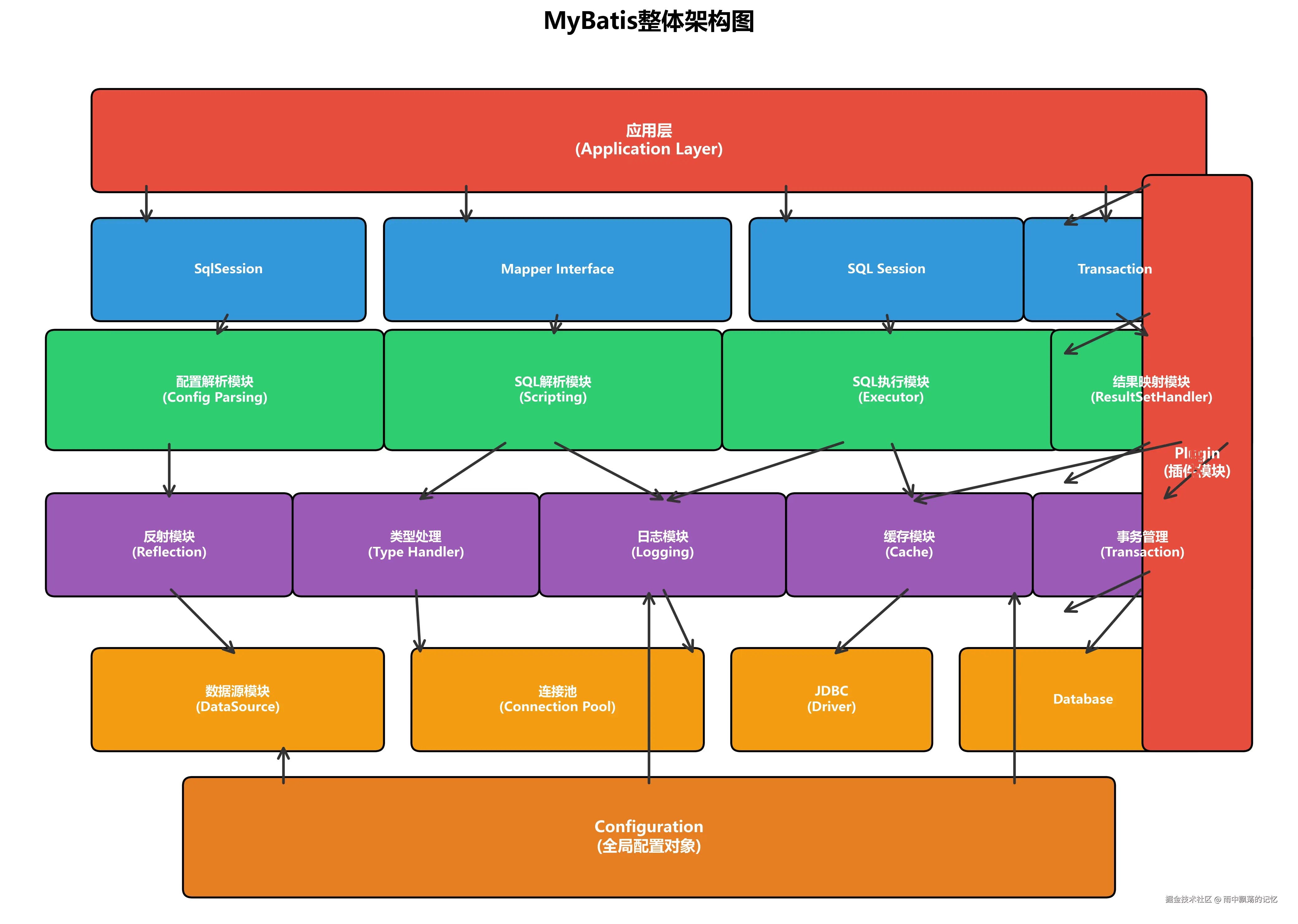 从上图可以看出,MyBatis采用了分层架构设计,而插件模块(Plugin)通过动态代理机制横切整个框架,能够在核心组件的执行过程中插入自定义逻辑。它为MyBatis提供了强大的扩展能力,使得开发者可以在不修改源码的情况下增强框架功能。