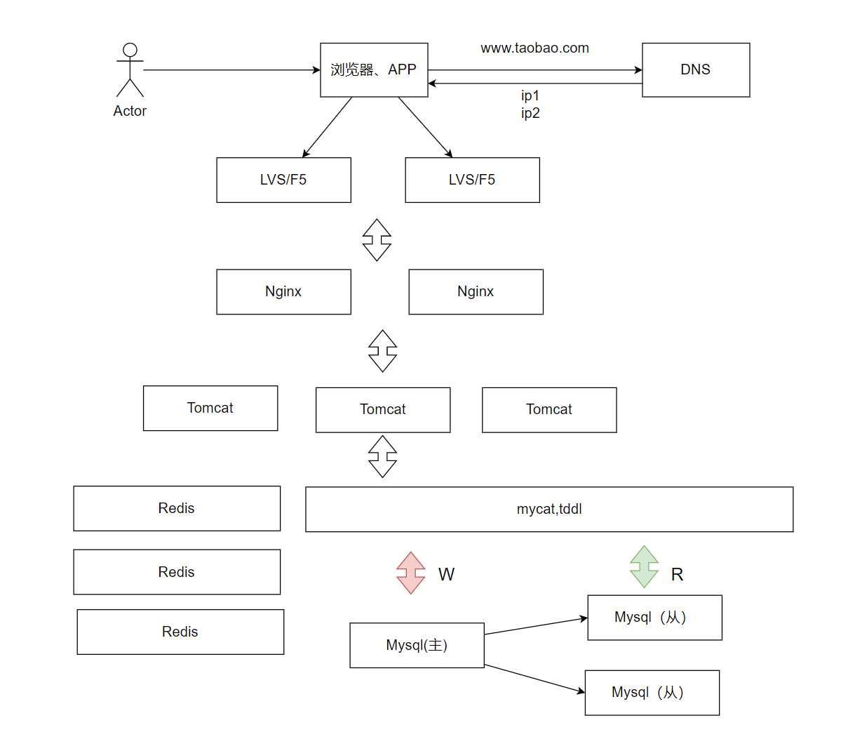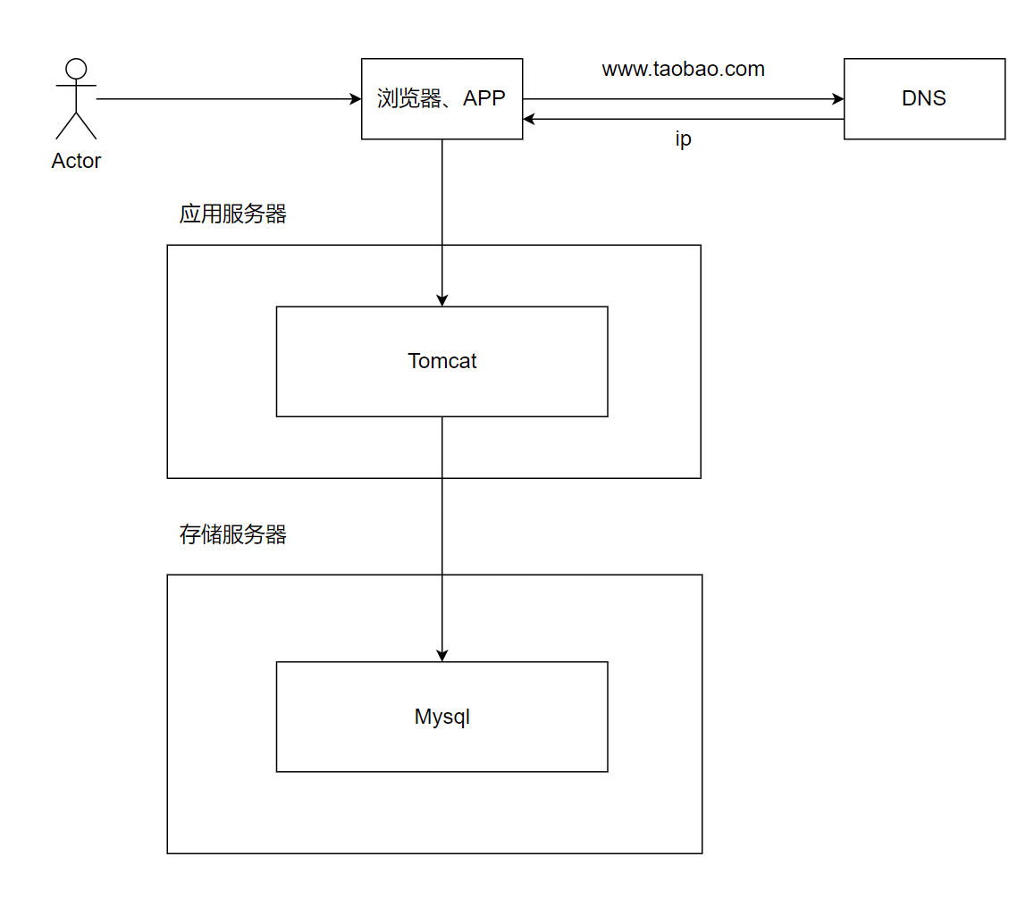 此时服务器数量成为了主要需求,购买服务器也成为了这段时期的主要手段。架构模拟如下: