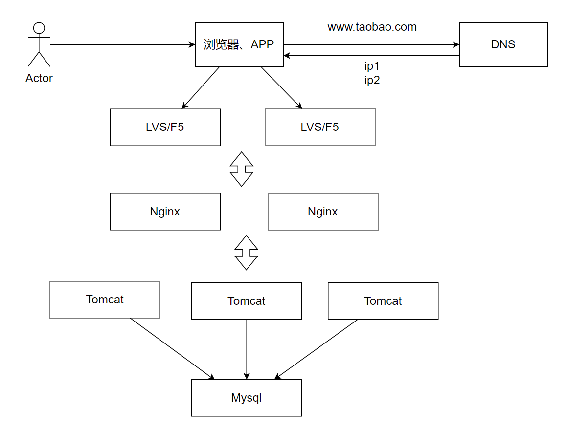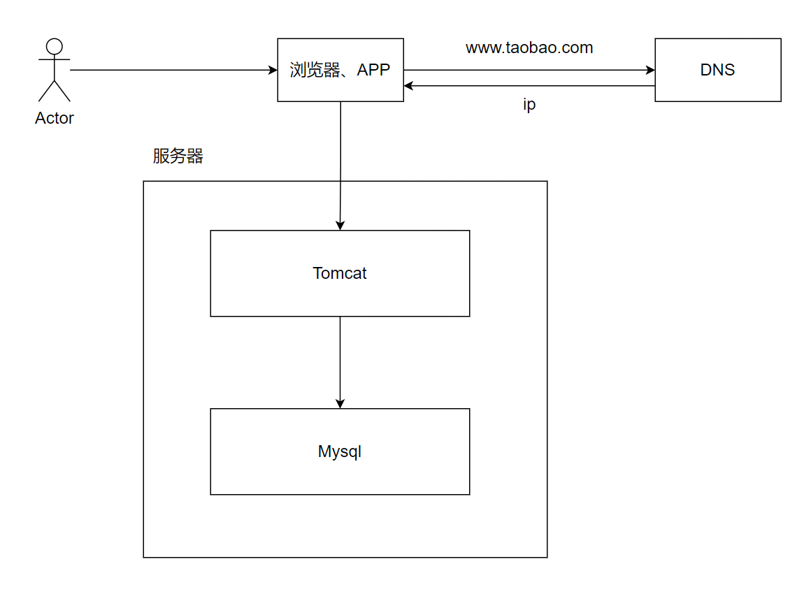用户在浏览器中输入网址,首先经过 DNS 服务将域名解析成 IP 地址,随后浏览器访问该 IP 对应的应用服务。