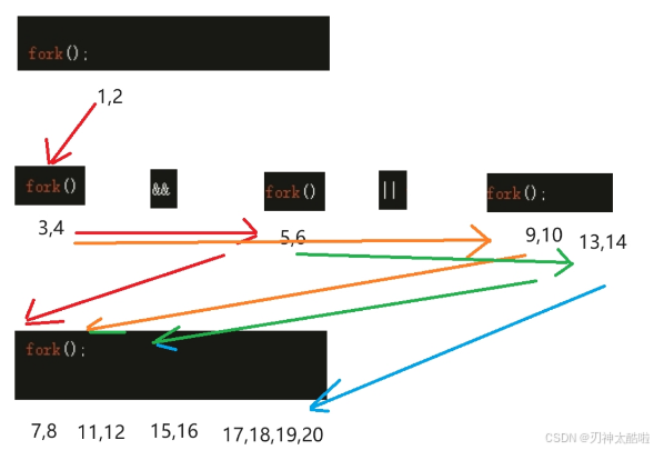 1,2进程的话,创建了3,4进程,1,2进程又创建了5,6进程--他们给1,2进程返回的都是自己的pid,然后在自己进程中给自己返回的是0