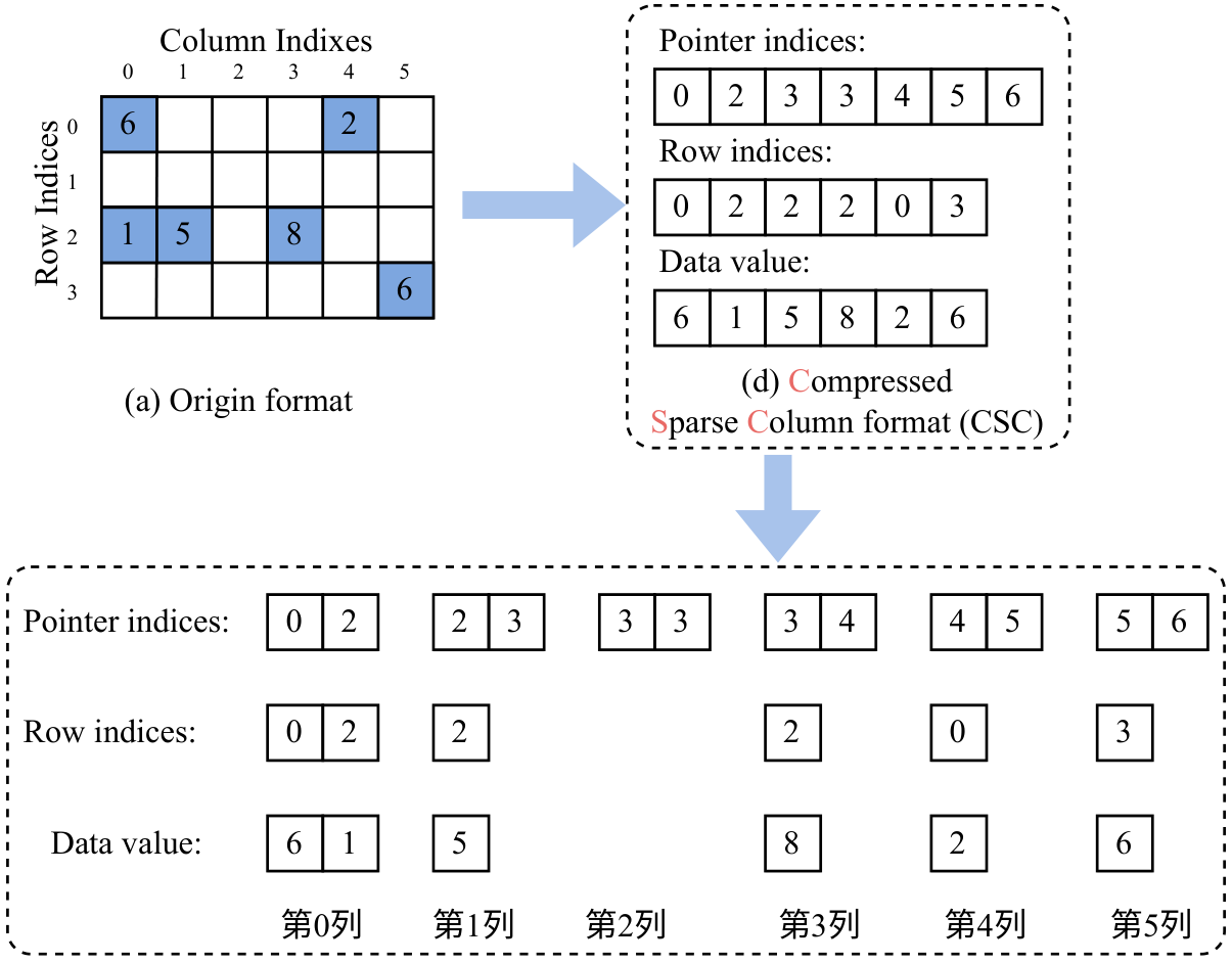 - Pointer indices: 第i个值记录原始矩阵第i列元素在Data value数组的起始位置(包含),第i+1个值记录原始矩阵第i列元素在Data value数组的终止位置(不包含)