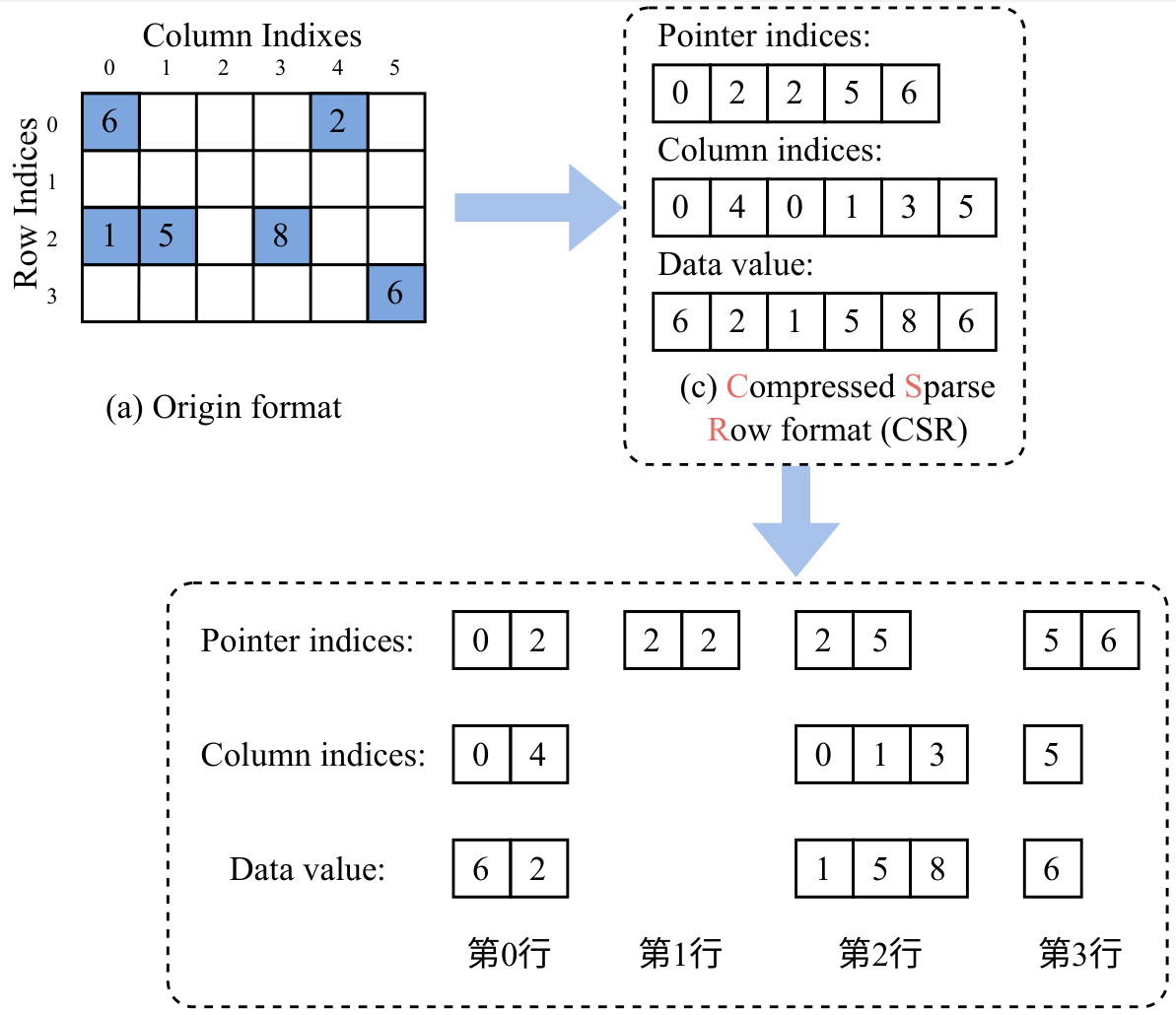 - Pointer indices: 第i个值记录原始矩阵第i行元素在Data value数组的起始位置(包含),第i+1个值记录原始矩阵第i行元素在Data value数组的终止位置(不包含)
