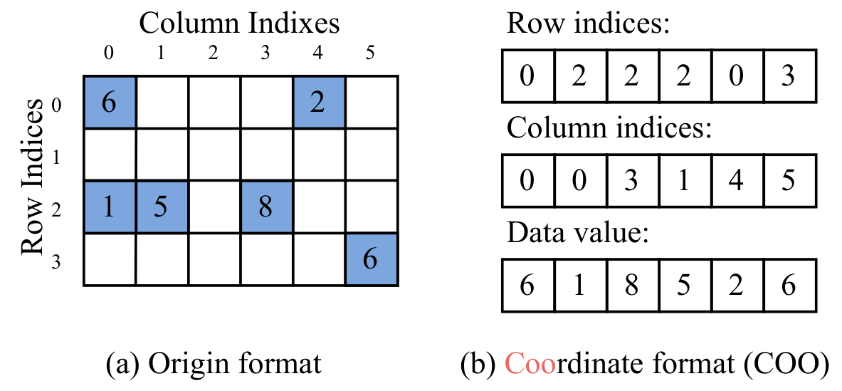 - Data value: 非零元素值(non-zero, NNZ)