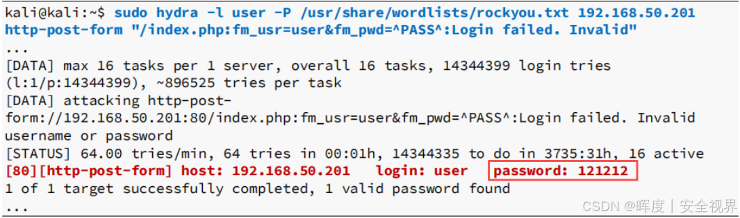 在上面收集好**"POST请求主体的提交用户名、密码的格式"** ,以及**"失败登录标识符"**后。可以开始使用Hydra并组装这些部分开始进行密码破解了。